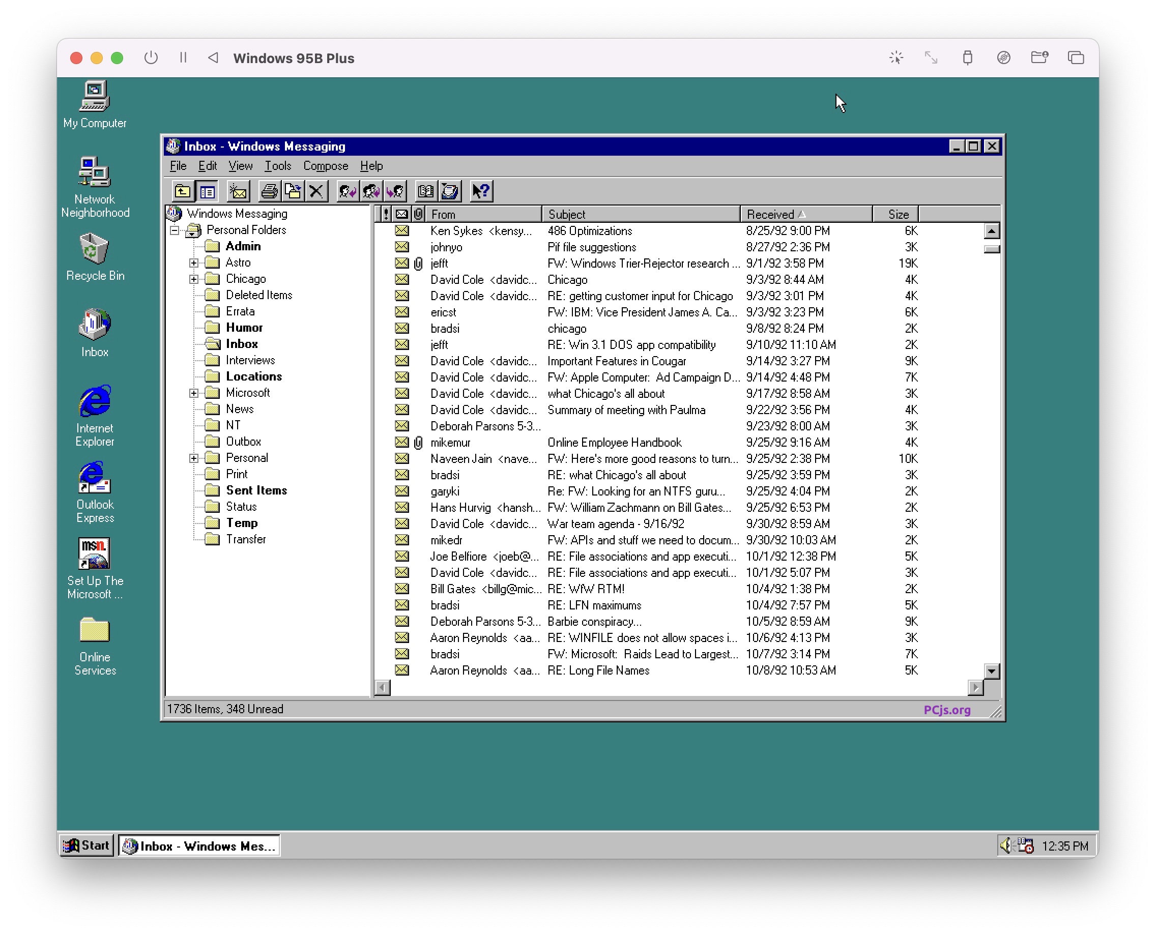 Using QEMU, Windows 95 and the “Inbox” (Windows Messaging) application were easy enough to setup, and Windows Messaging seemed willing to import my MMF files. But anticipation quickly turned to disappointment when it prompted me for a password. I had vague recollections of some passwords that I might have used over 30 years ago, but nothing I tried worked.